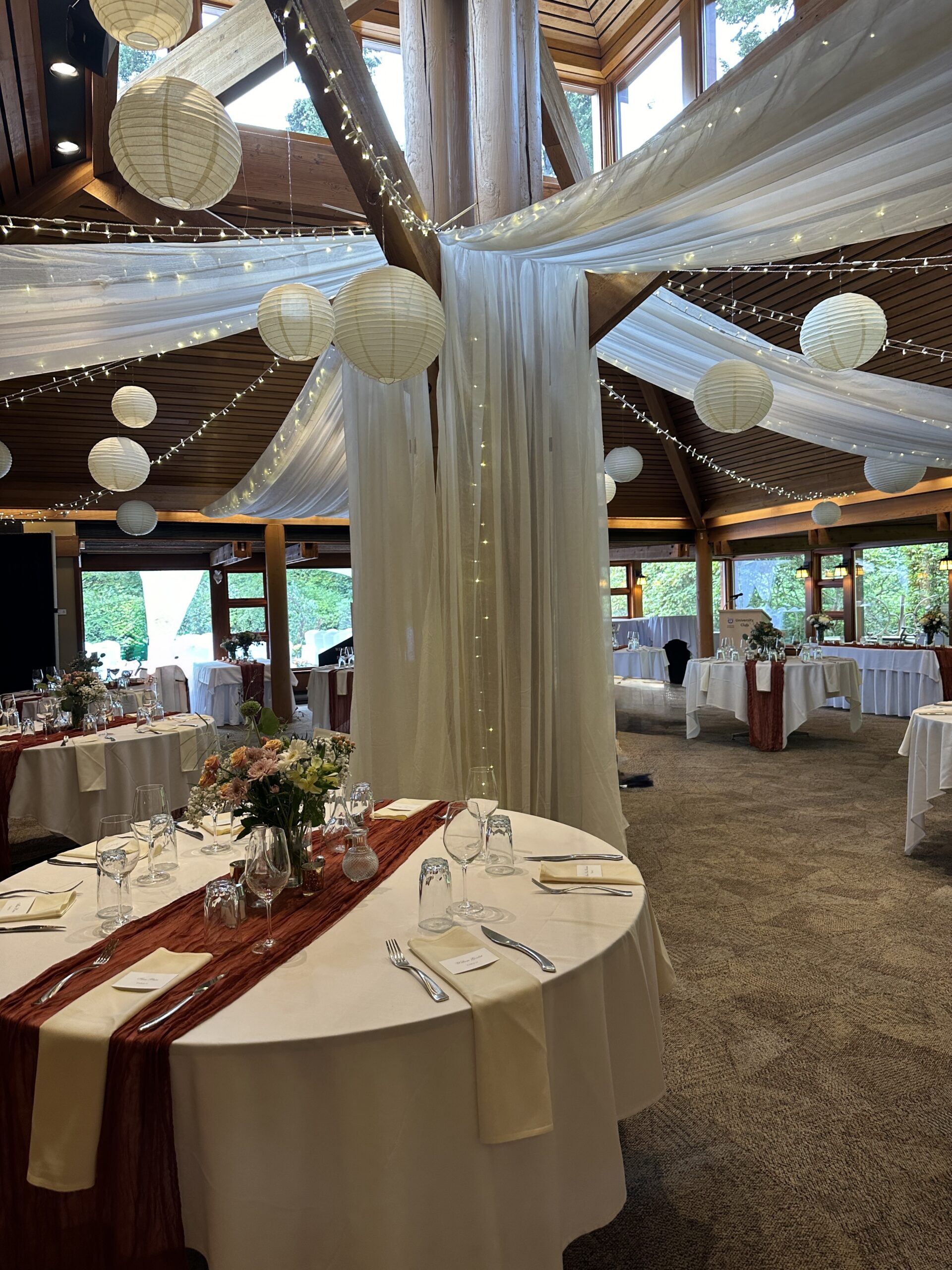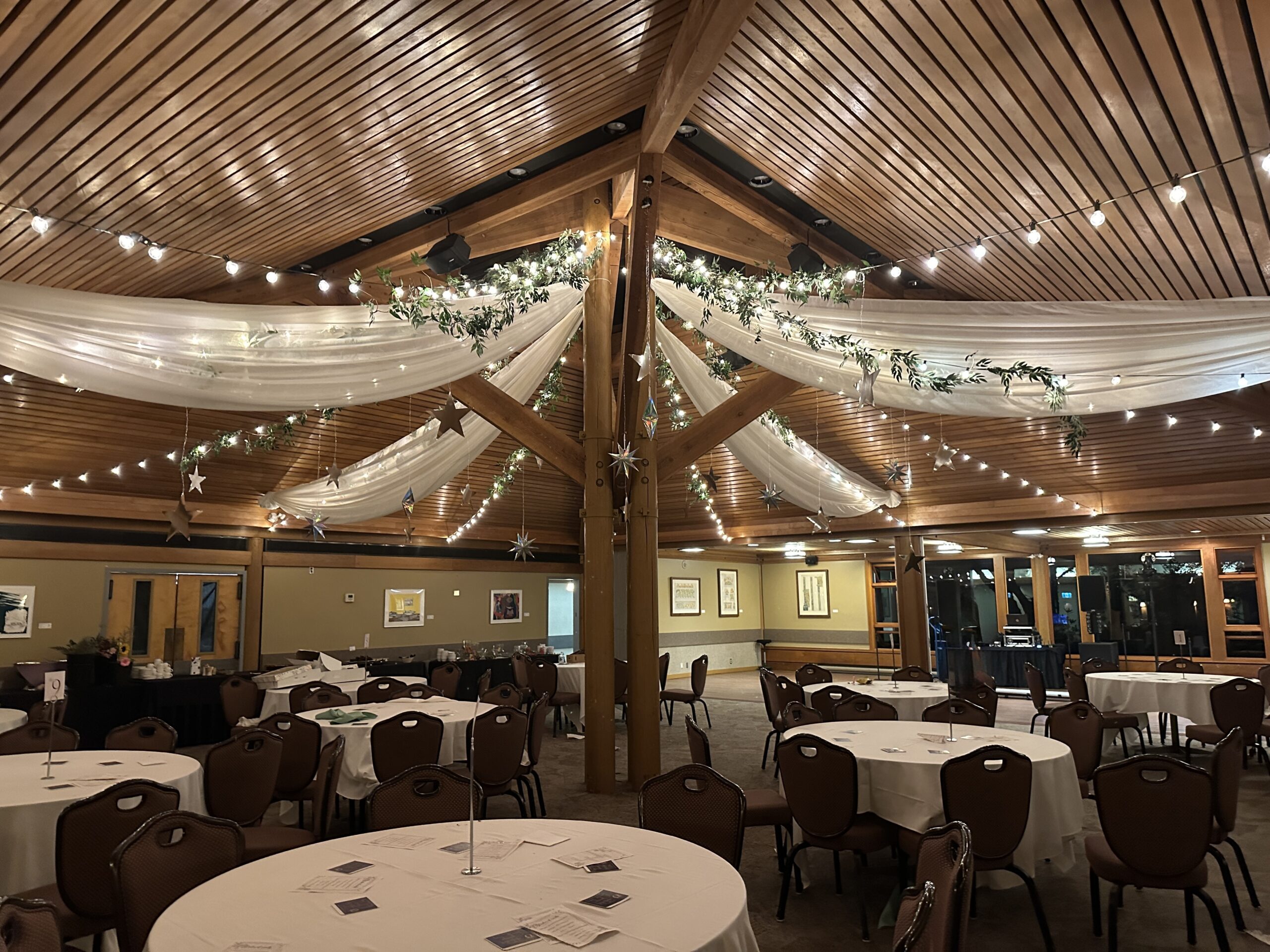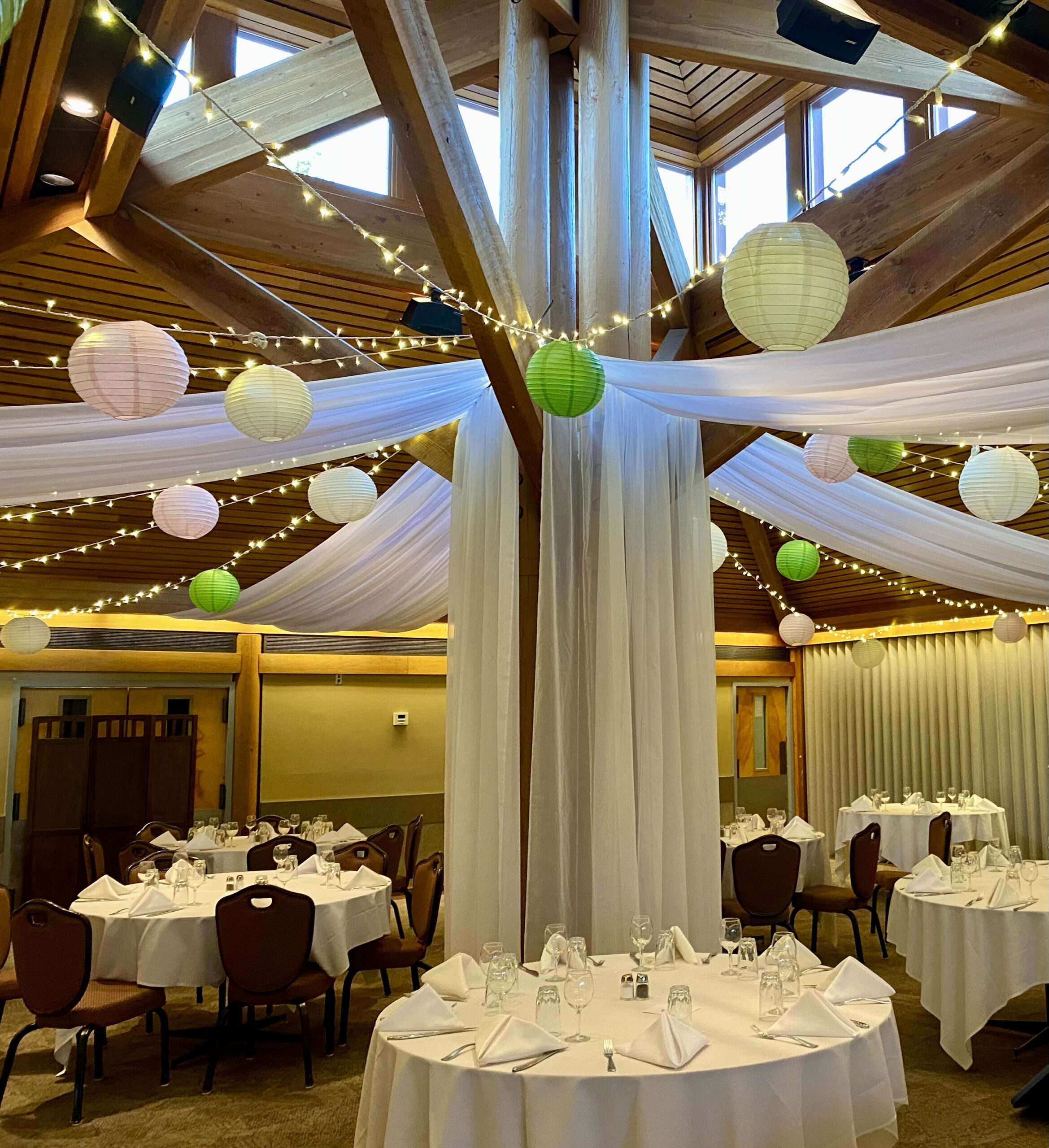 Combination Ceiling Package is a combination of fabric, lights and paper lanterns.  You can choose the color of your fabric, the color of the lanterns and the type of lighting you want.  The possibilities are endless.  Create a simply unique ceiling for a unique wedding.