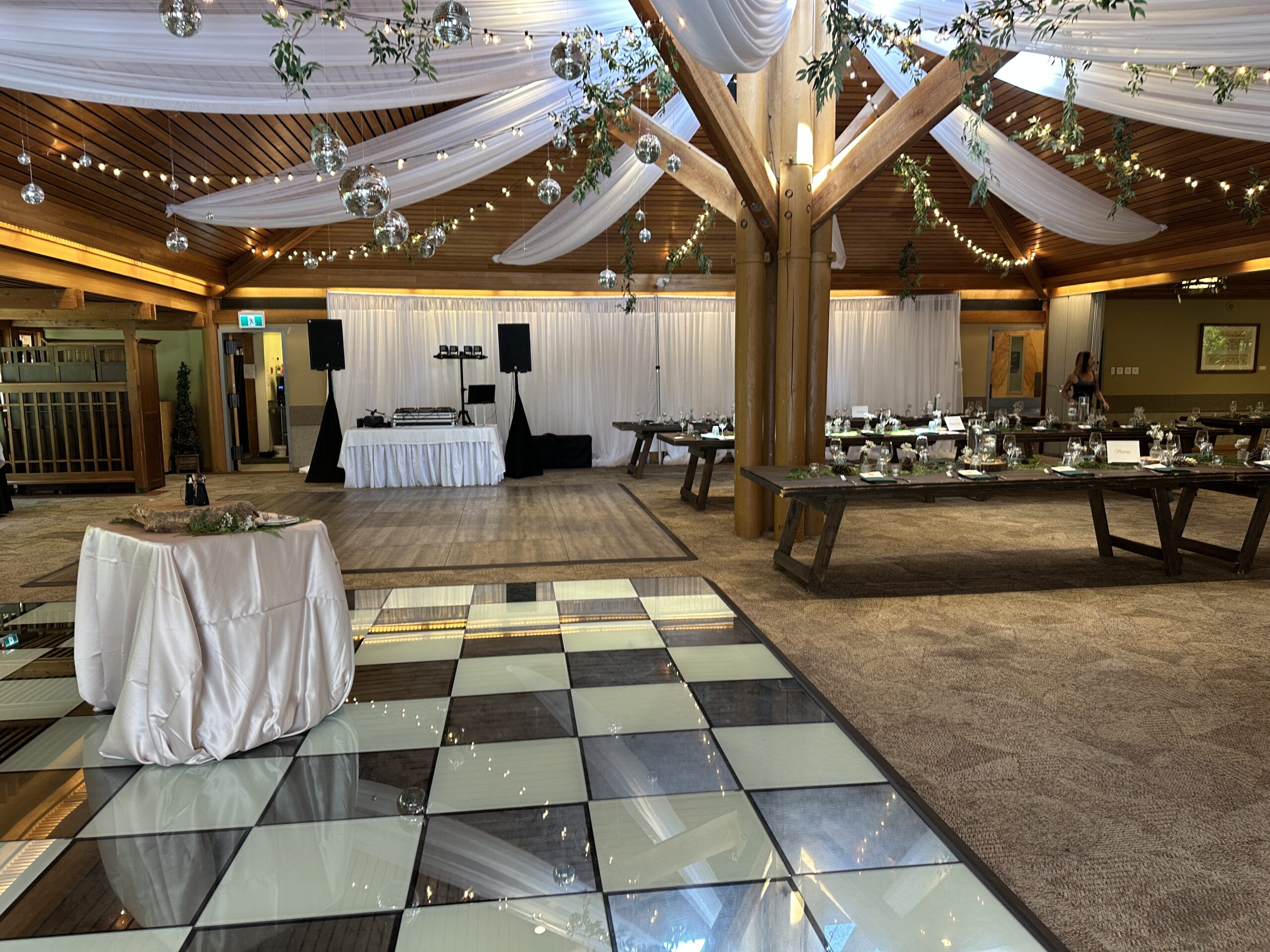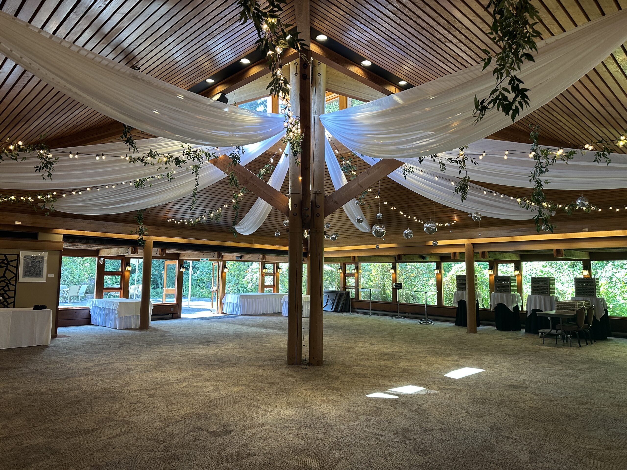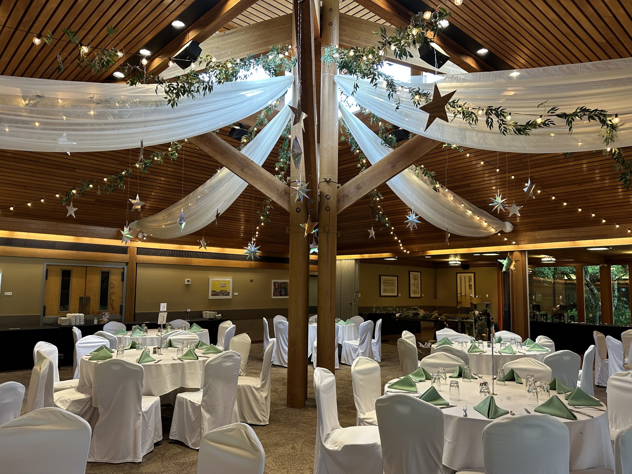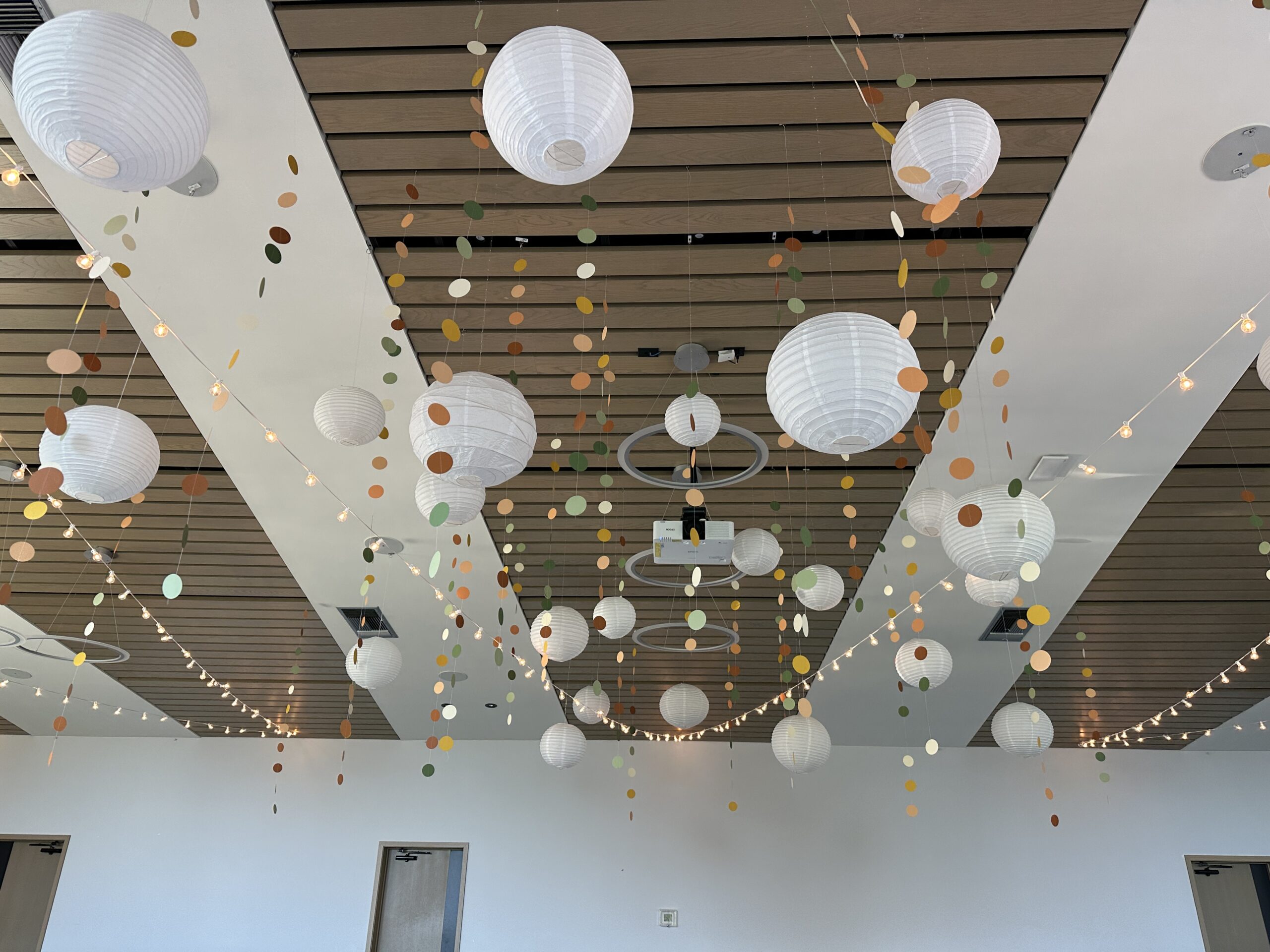 Combination Ceiling Package is a combination of fabric, lights and paper lanterns.  You can choose the color of your fabric, the color of the lanterns and the type of lighting you want.  The possibilities are endless.  Create a simply unique ceiling for a unique wedding.